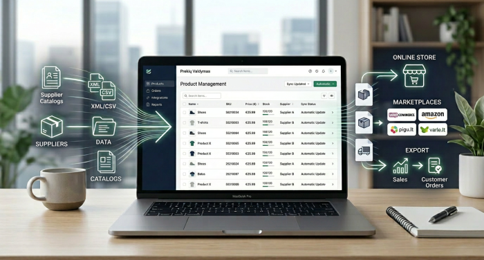 - Eksportą į WooCommerce, Pigu.lt, Varle.lt ir kitus kanalus.