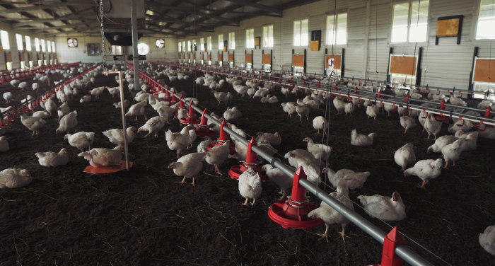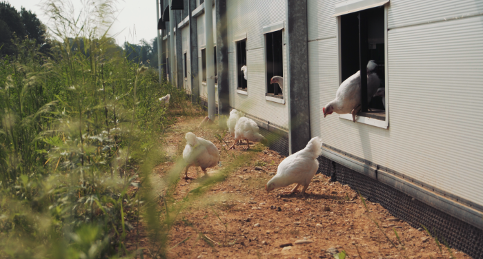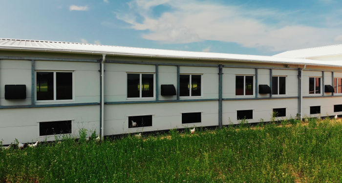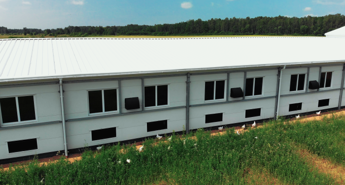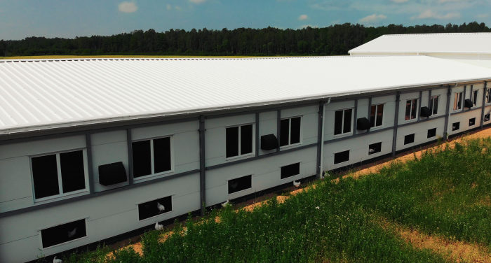 Du paukštininkystės pastatai, kiekvienas padalintas į dvi sekcijas – efektyviam darbo organizavimui.