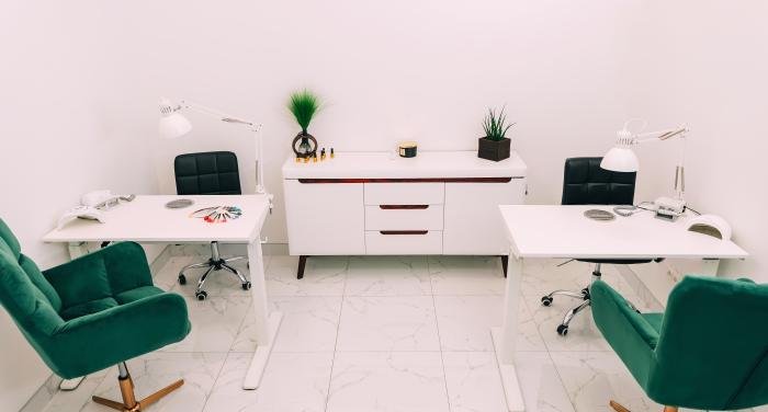 2 **manikiūro stalai** su integruotu dulkių ištraukimu (jokių dulkių ir chaoso!).