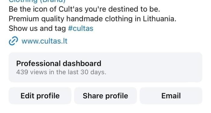 Instagram paskyra – Įdomūs ir stilingi įrašai, aktyvi 989 sekėjų bazė (NE PIRKTŲ BOT’Ų), bei keletas influencerių, reklamuojančių mūsų drabužius. Paskyra bus visiškai perleista naujam savininkui.